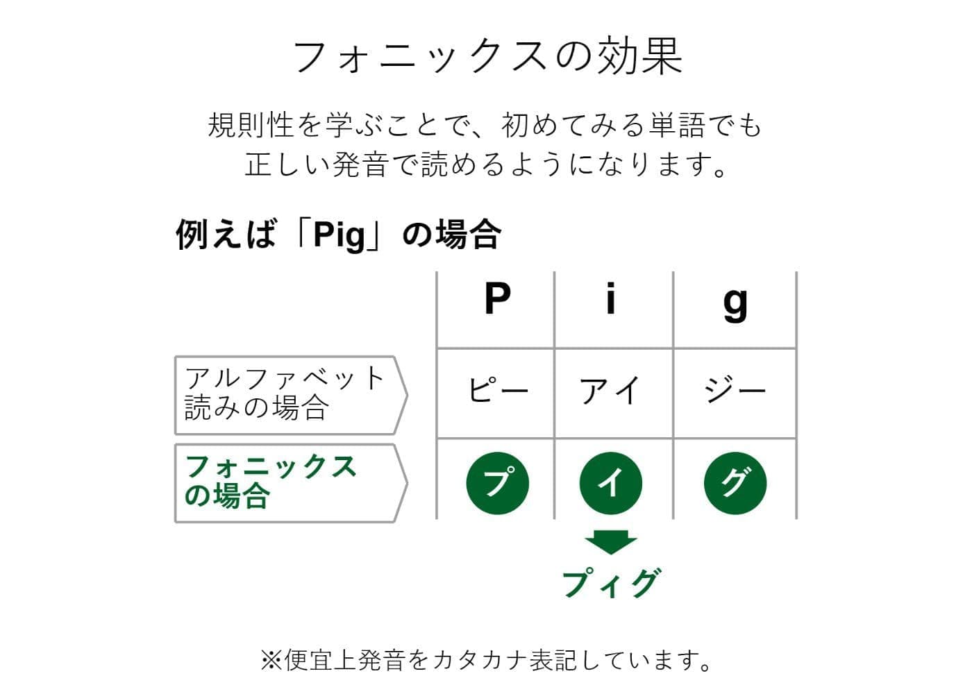 初めてみる単語でも正しい発音で読むことができるようになります。さらに、正しい発音で覚えた単語は、スペルを暗記しなくても書くことができるようになります。